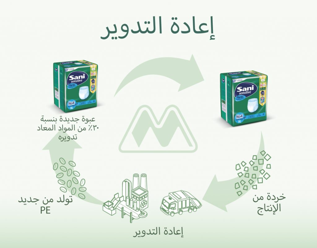 تحتوي جميع عبوات Sani Sensitive على 30٪ من المواد المعاد تدويرها. يتم جمع الخردة الناتجة عن إنتاج أكياس البولي إيثيلين (PE) في مصنعنا وإعادة تدويرها وأخيراً تولد من جديد كمادة أولية (حبيبات البولي إيثيلين) ثم تعود إلى موردنا الذي ينتج الأكياس التي تحتوي على 30٪ من البولي إيثيلين المتجدد. ينشئ هذا الإجراء دورة إعادة تدوير كاملة ومغلقة ، مع التحكم المطلق في جودة ومنشأ المواد المعاد تدويرها.