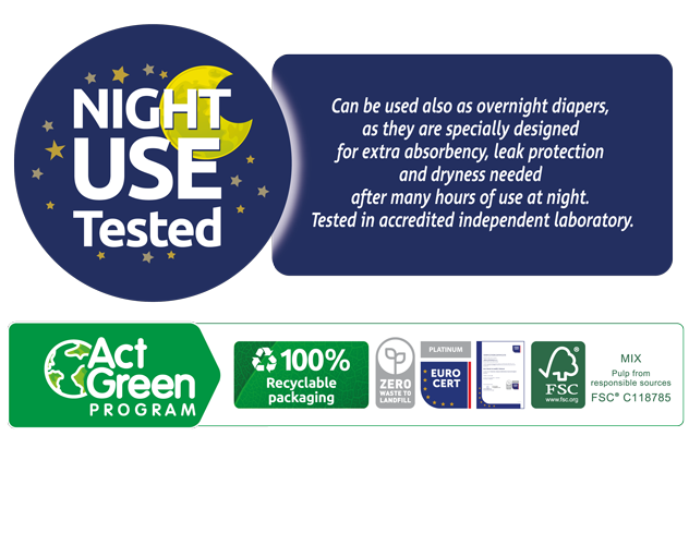 With proven skin-friendliness certified by OEKO-TEX® STANDARD 100 for the absence of harmful substances. Clinically tested with excellent results from Dermatest Laboratory (Germany). They feature a hygienic extra soft topsheet with Aloe Vera extract and Vitamin E for extra sensitive skin care.
