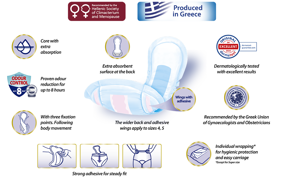 The only incontinence pads recommended by the Greek Union of Gynecologists and Obstetricians and the Hellenic Society of Climacterium and Menopoause.