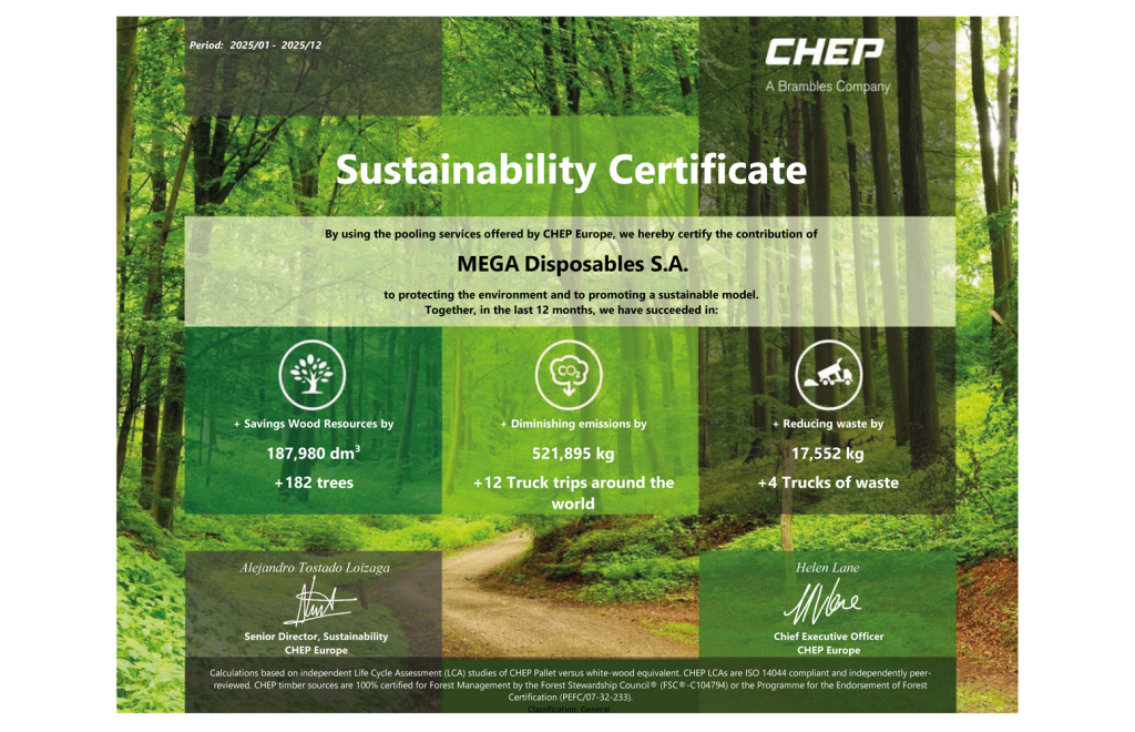MEGA has received the sustainability certificate for the protection of the environment and the promotion of a sustainable supply chain model through its participation in the Pooling system of CHEP, contributing to reducing timber, carbon dioxide emissions and waste emissions.
